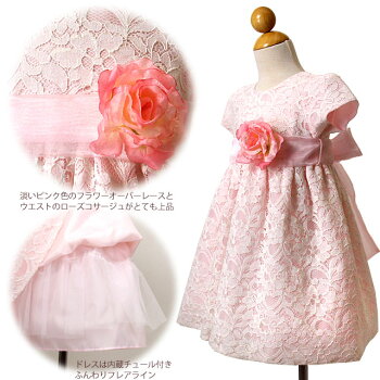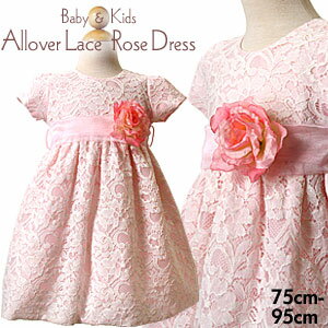 SALE ベビードレス 女の子 70 80 90 結婚式 お宮参り お祝い プレゼント セレモニー フォーマル レース ワンピース バラのコサージュ付きオーバーレース半袖ベビードレス「ピンク」