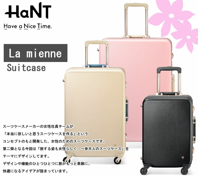 【検索ワード】海外旅行用/旅行用品/トラベル/スーツケース/キャリーバッグ/かばん/鞄/【RCP】HaNT【ハント】のスーツケースは、スーツケースメーカーの女性社員チームが「本当に欲しいと思うスーツケースを作る」というコンセプトのもと開発した、女性のためのスーツケースです。