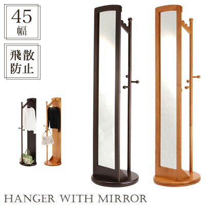 ハンガーミラー 幅45cm ミラー付き ハンガーラック 収納付き 回転 ハンガー スタンドミラー 天然木 鏡 全身鏡 ミラー 姿見 フック スタンド 木製 おしゃれ 飛散防止 ダークブラウン シンプル 玄関 衣類【スーパーセール割引】