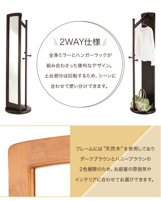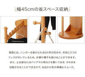 商品詳細 サイズ 本体:幅45×奥行45×高さ171cm ミラー:幅22×高さ149cm フック:8cm 仕様 材質:天然木(ラバーウッド材) 塗装:ラッカー塗装 ミラー:4.5mm厚(飛散対策仕様) 耐荷重:各フック1kg / 下部4kg / 上部凹み1つ分2kg 商品重量:15kg ・フック3本 ※お客様組み立て品(約45分) 商品説明 衣類を掛けていてもクルっと簡単に回転できます。